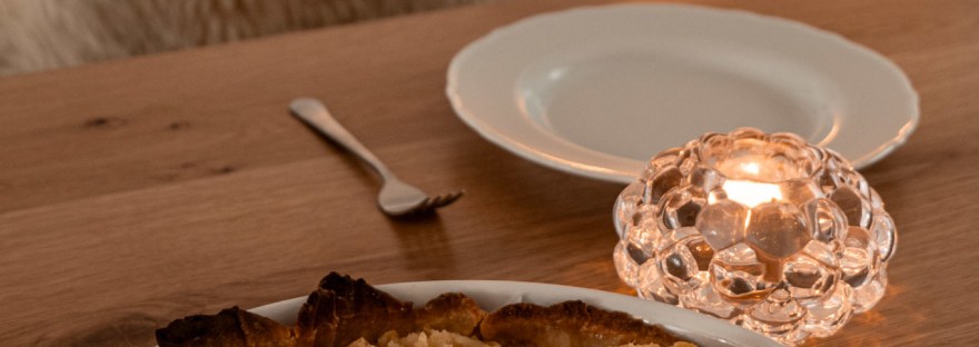 Cette recette est un grand classique de nos dimanche en automne et hiver. Elle provient du chef d’un ancien restaurant de Thionville de bonne facture qui a fermé voilà quelques années (L’auberge du Crève-Cœur). Ce chef était passé au Moselle TV et il y présentait sa tarte Maria, nommée ainsi en l’honneur de sa grand-mère. Cette tarte ne ressemblait à aucune tarte aux pommes que j’avais déjà vue, je me suis d’ailleurs dit que c’était très bizarre quand il l’a sortie du four avec cette peau tout cramée au-dessus mais finalement ça a suffisamment éveillé ma curiosité pour que je teste la recette. Et voilà une bonne dizaine d’années que je la fais, que tout le monde me la réclame et que je prends toujours autant de plaisir à manger alors que les tartes ne sont pas vraiment la passion de ma vie…