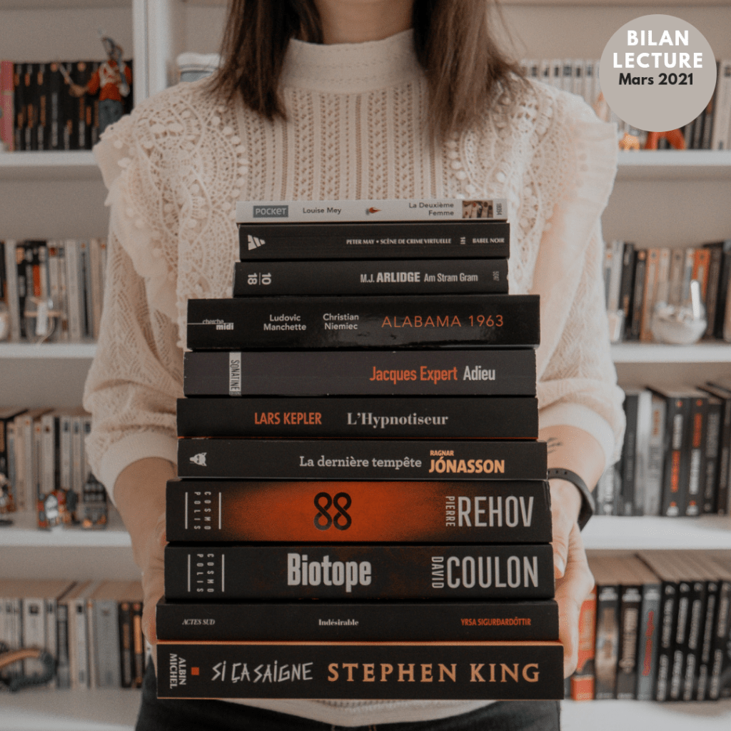 Mars, moi hyyyper chargé, je n’avais pas lu autant un même mois depuis… Très longtemps ! Il faut en effet remonter jusqu’à juillet 2020 pour trouver un bilan lecture aussi fournie, car je tourne habituellement à 6 ou 7 romans par mois… Là j’ai pété tous les scores avec pas moins de 11 lectures !